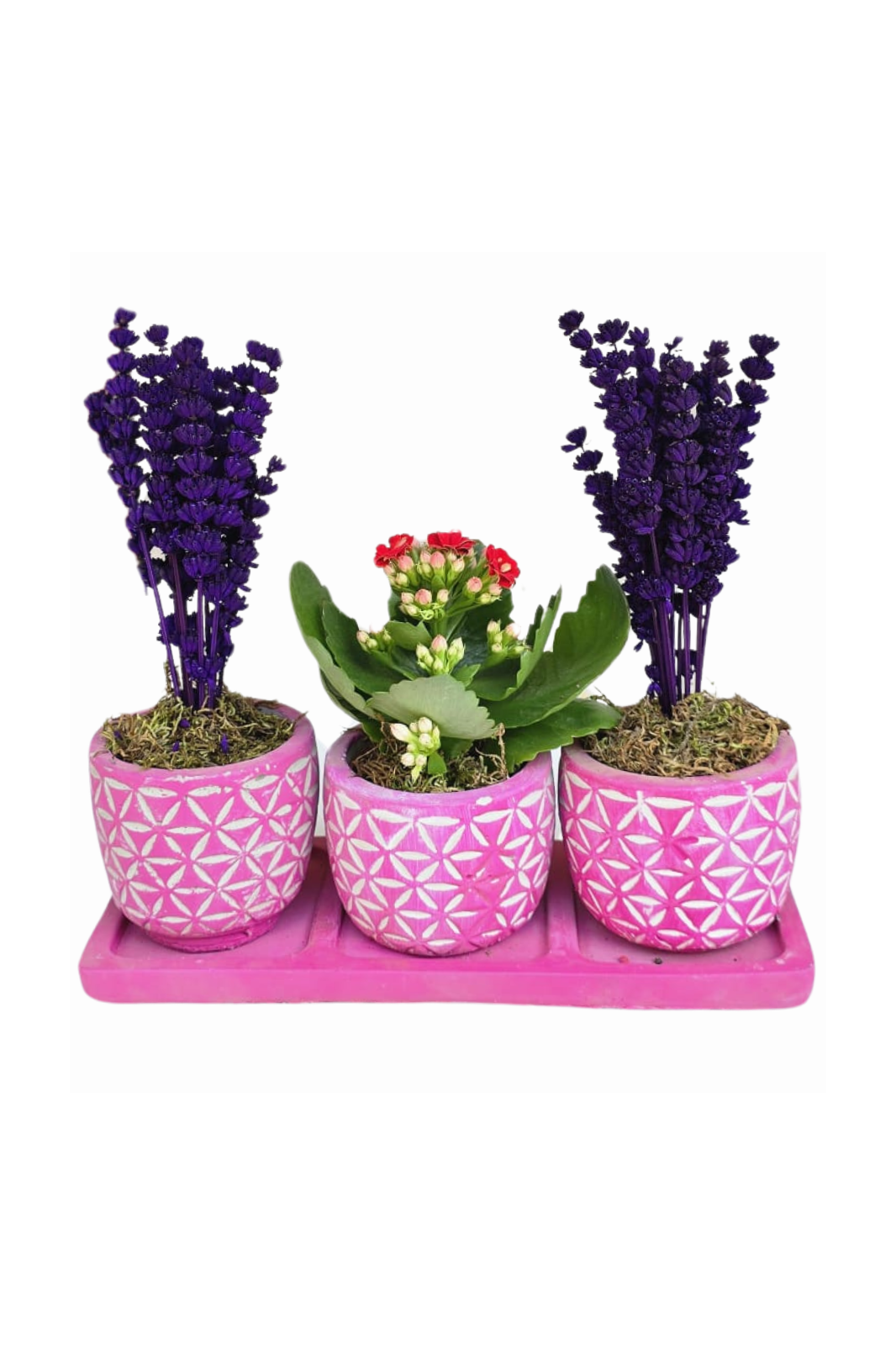 Beton saksı içerisinde; 1 adet kalanchoe türü sukulent ve şoklanmış lavanta kullanılarak hazırlanan bir aranjmandır.