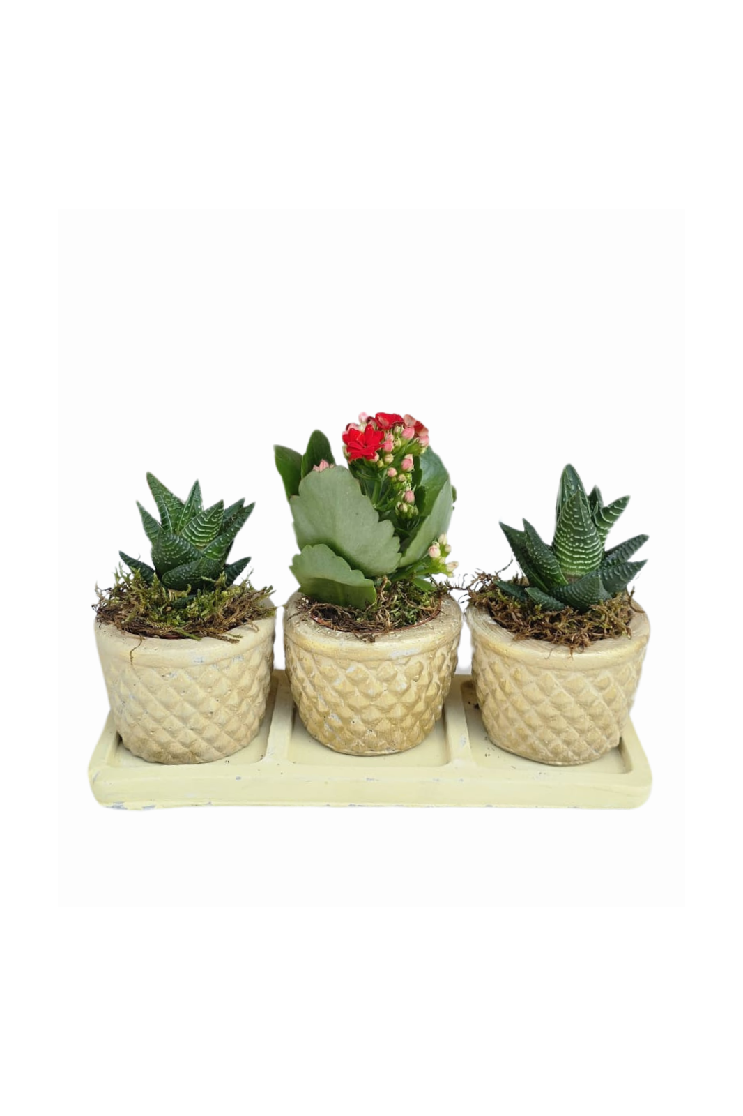 Beton saksı içerisinde; 1 adet kalanchoe türü sukulent ve 2 adet howartia kullanılarak hazırlanan bir aranjmandır.