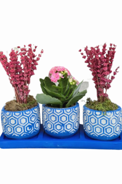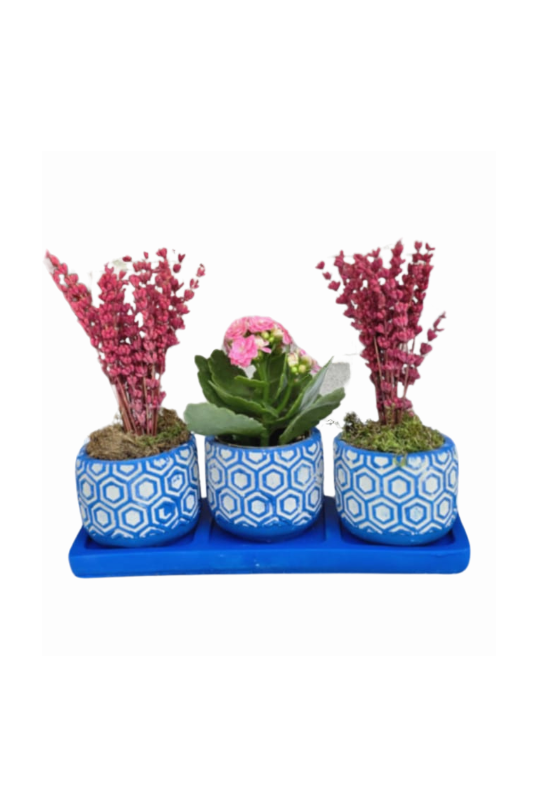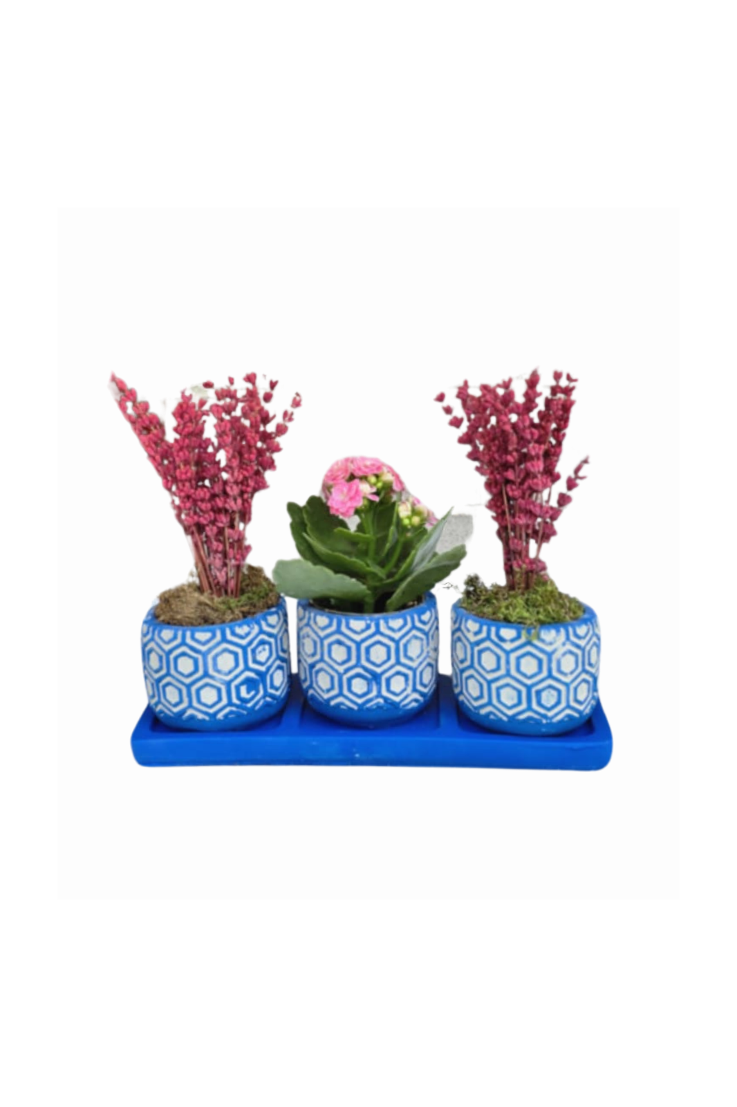 3'lü mavi beton saksıda kalanchoe ve lavanta