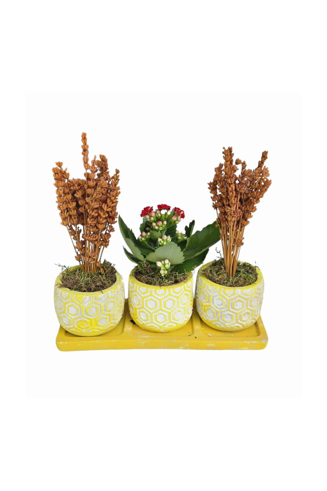 3'lü Sarı Beton Saksıda Kalanchoe Ve Lavanta