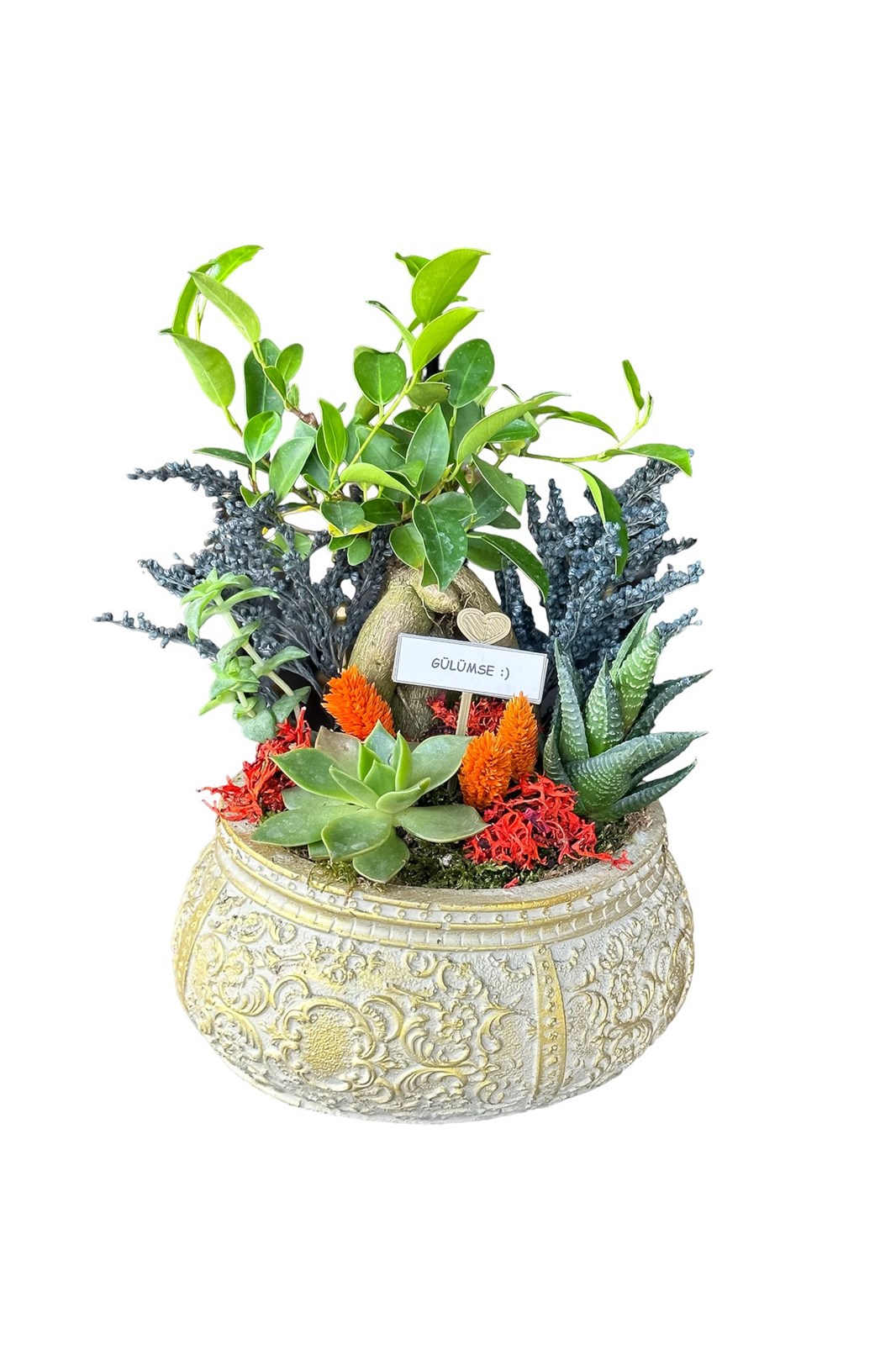 Antik serisi saksı içerisinde mini bonsai, echeveria türü sukulent, haworthia, şoklanmış kuru bitkilr, geyik yosunu ve kuru yosun kullanılmıştır. doğru bakım ile size ve sevdiklerinize uzun yıllar eşlik edecek şık ve dekoratif bir üründür. bitkilerin dip kısımlarına hafta birgün az miktar su vermeniz yeterli olacaktır. Bahçe tabelası sayesinde dilediğiniz şekilde kişiselleştirme yapabilirsiniz.