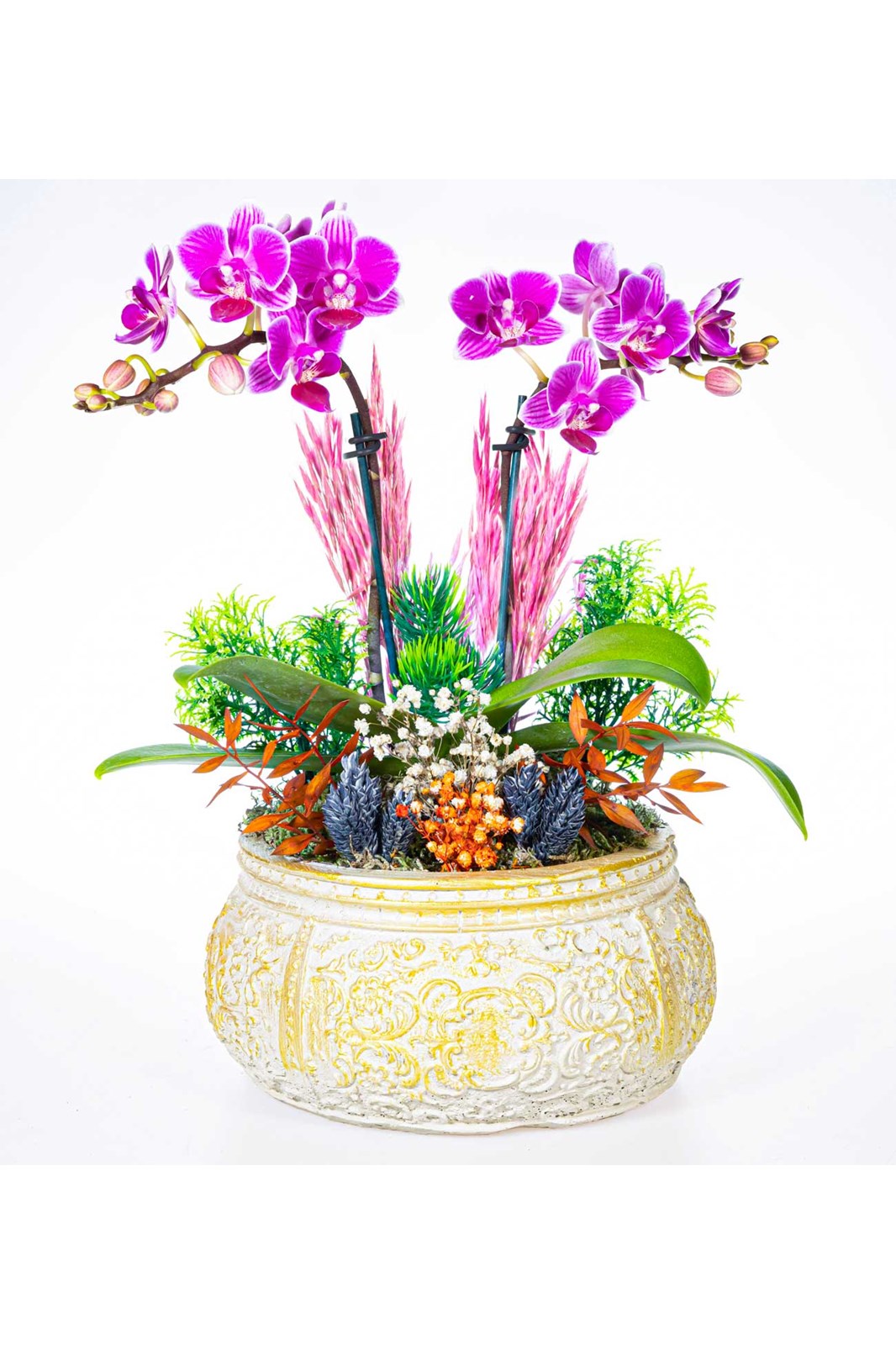 Antik serisi dekoratif beton saksıda çift dallı mini orkide, kuru ve şoklanmış bitkiler, kuru yosun ve yapay bitkiler kullanılarak tasarlanmıştır.Yaşam alanlarınıza modern ve şık bir hava katacak çift dallı mini orkide aranjmanımız doğru bakım ile size ve sevdiklerinize uzun süre eşlik edecek şık ve dekoratif bir hediyedir.