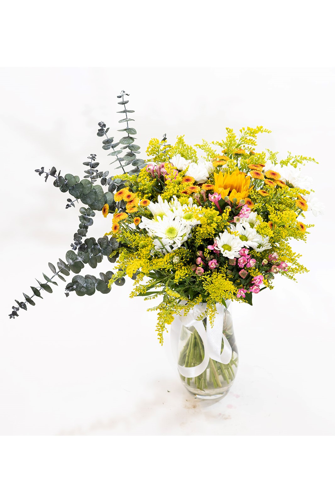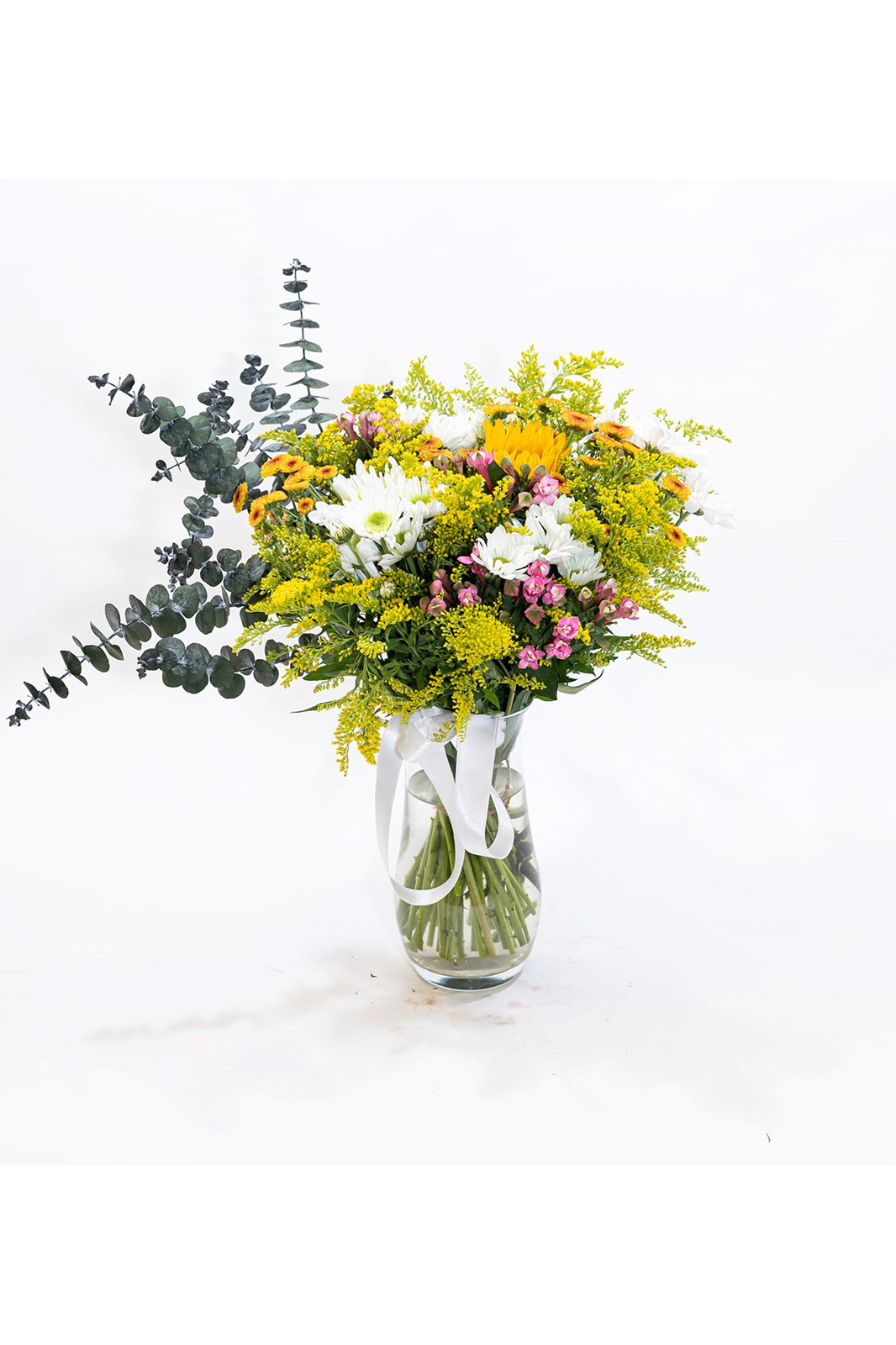 Sitemizdeki özel tasarım çiçek aranjmanları, doğanın zarafetini evinize taşıyor. Cam vazo içindeki bu özel aranjman, papatyalar, mevsim çiçekleri, okaliptüs dalları ve soli bitkisi kullanılarak hazırlanmış, doğal ve taze bir güzellik sunuyor.