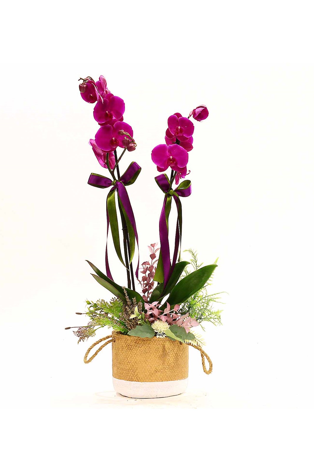 Dekoratif saksıda özel üretim çift dallı fuşya orkide, yapay çiçekler ve yosun kullanılmıştır. Bu ürün Size ve sevdiklerinize doğru bakım ile uzun yıllar eşlik edecek şık ve dekoratif bir hediyedir.