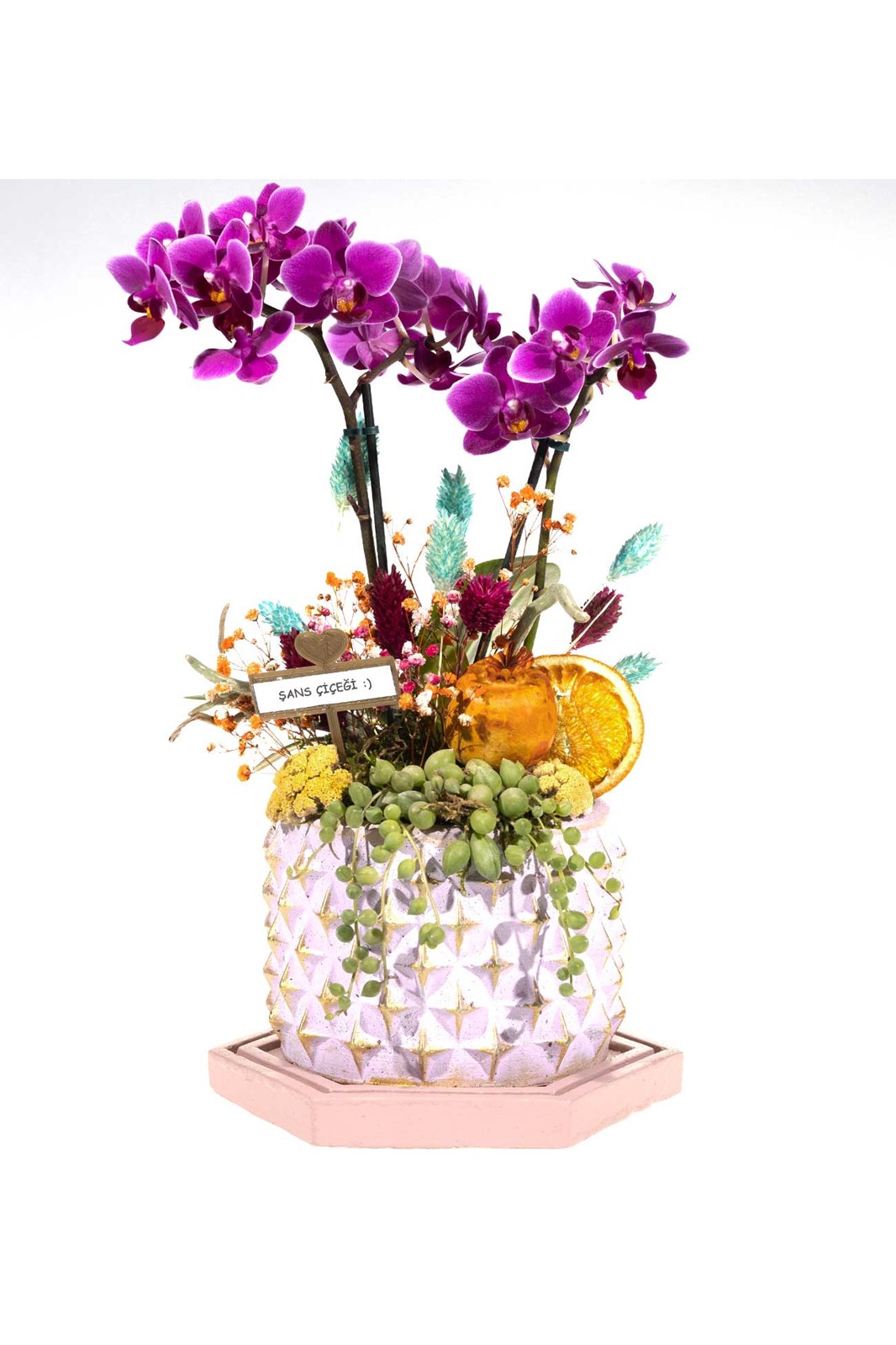 Taş saksıda orkide tasarımıdır. Mini orkide, senecio türü sukulent, kuru ve şoklanmış bitkiler, kişiselleştirme için tabela kullanılmıştır. Son derece şık ve dekoratif bir üründür. Doğru bakım ile uzun yıllar size ve sevdiklerinize eşlik edecek bir hediyedir.