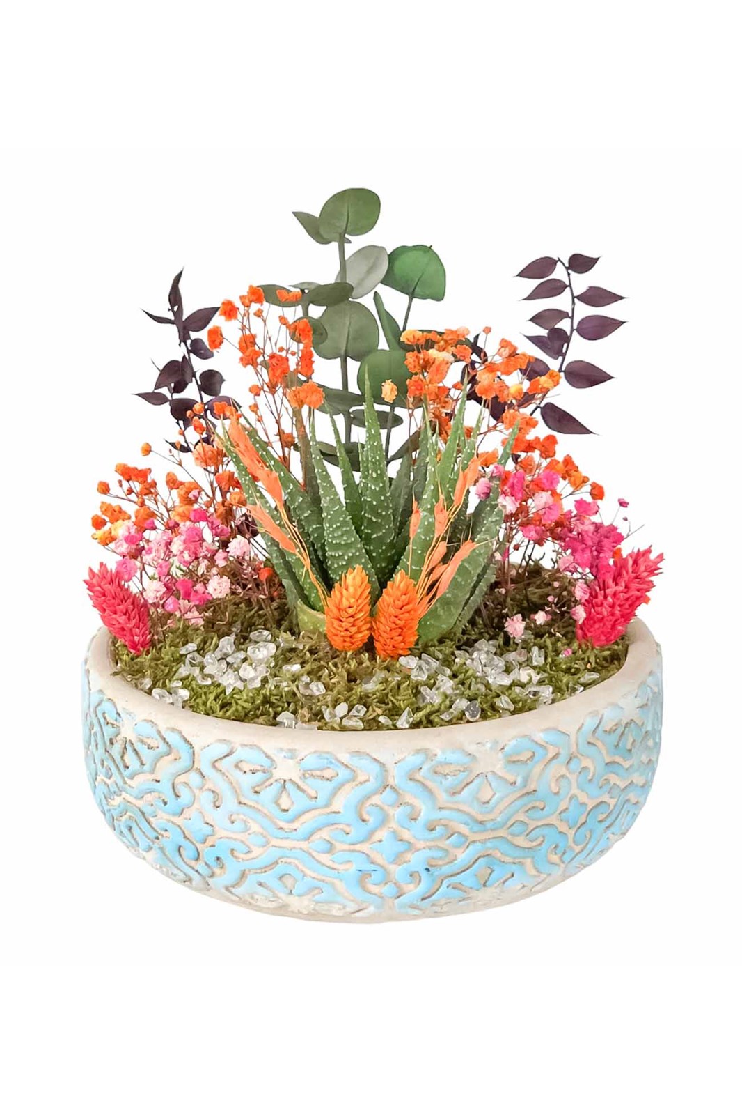 Dekoratif saksıda saksıda; 1 adet haworthia türü sukulent, şoklanmış kuru bitkiler, şoklanmış çipso, okaliptus yaprakları, kuru yosun ve cam kırıkları ile dekore edilmiştir. size ve sevdiklerinize hoş ve dekoratif bir hediyedir.