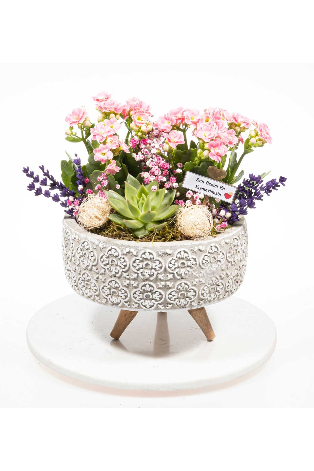 Hayalinizdeki büyülü bir dünya, bu zarif mini bahçeyle gerçeğe dönüşüyor. Beton saksının rustik dokusu, bitkilerin ve dekoratif unsurların bir araya geldiği bu minyatür bahçeyi göz alıcı kılıyor. İçindeki Kalanchoe ve Echeveria bitkileri, yaşamın gücünü sembolize ediyor ve bu büyülü dünyaya canlılık katıyor.