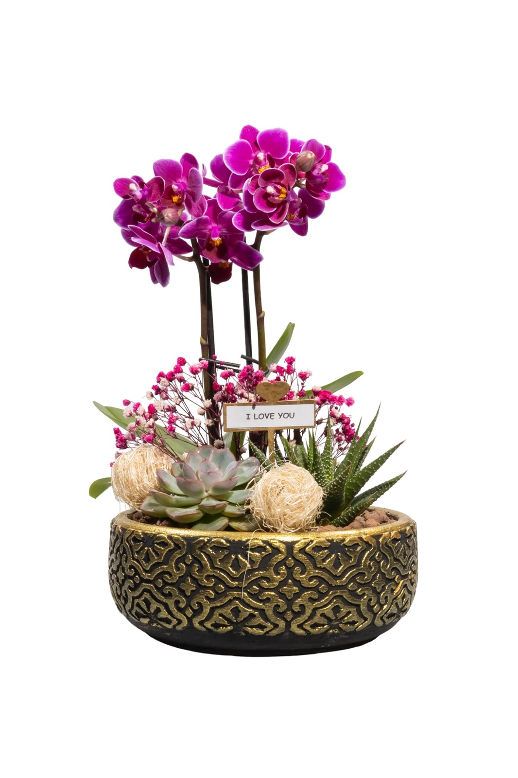 Desenli beton saksı içerisinde mini orkide, 2 adet echeveria, kuru bitkiler ve lava taşları kullanılmıştır.Doğru bakım ile size ve sevdiklerinize uzun yıllar eşlik edecek güzel ve dekoratif bir hediyedir. Mini orkide için 34 günde bir dibinden yarım çay bardağı su yeterli olacak ve vermiş olduğunuz su diğer sukulentler için yeterli olacaktır.