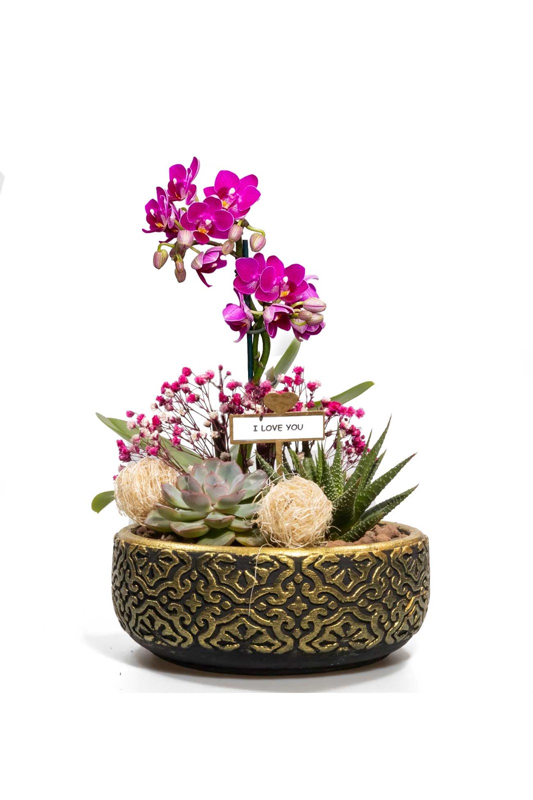 Desenli beton saksı içerisinde tek dal mini orkide, 2 adet sukulent, şoklanmış cipso, süsleme toplar, renkli taşlar ve kişiselleştirme için tabela kullanılarak tasarlanmıştır. Doğru bakım ile uzun yıllar size ve sevdiklerinize eşlik edecek şık bir hediyedir. Orkidelerimiz herhafta taze olarak gelmektedir.