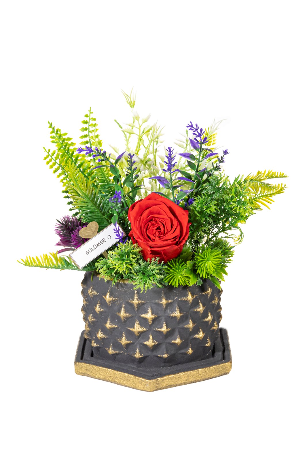 Bu tasarımımızda el yapımı yıldız desenli beton saksı içerisinde ithal yapay bitkiler ve solmayan kırmızı gül kullanılmıştır. hiçbir bakıma ihtiyaç duymadan size ve sevdiklerinize uzun yıllar eşlik edecek, evinizin veya ofisinizin dekorasyonunu tamamlayıcı şık ve zarif bir üründür.