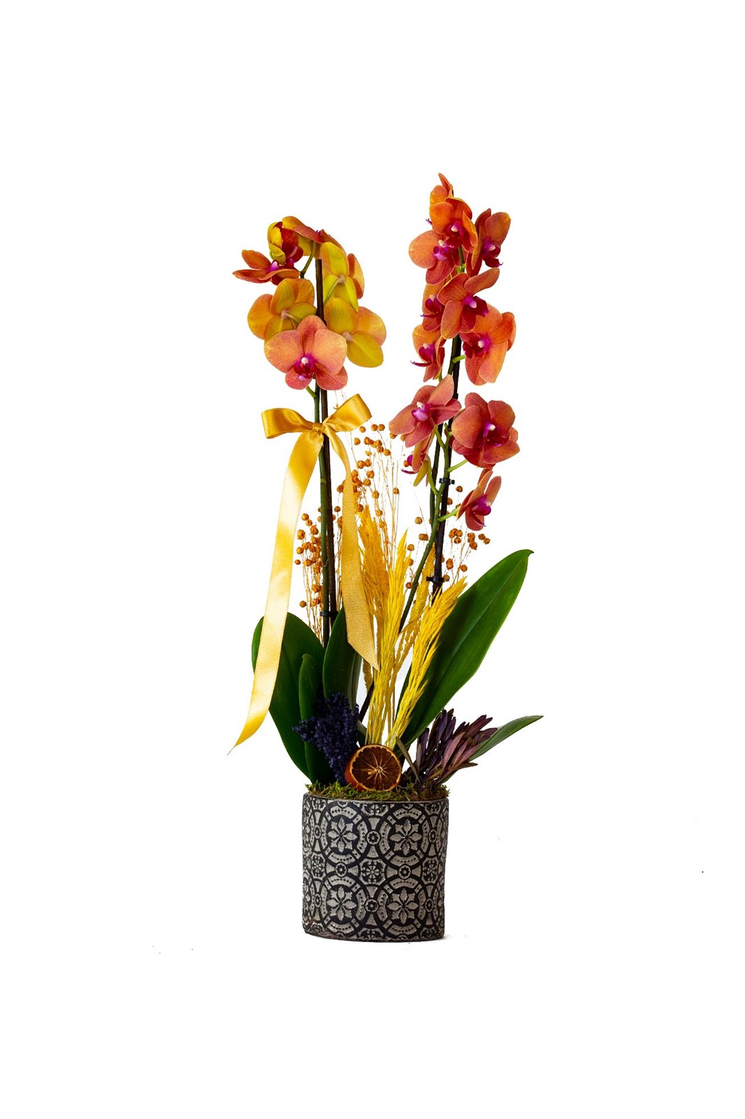 Eskitme Görünümlü Desenli Saksıda Ateş Orkidesi