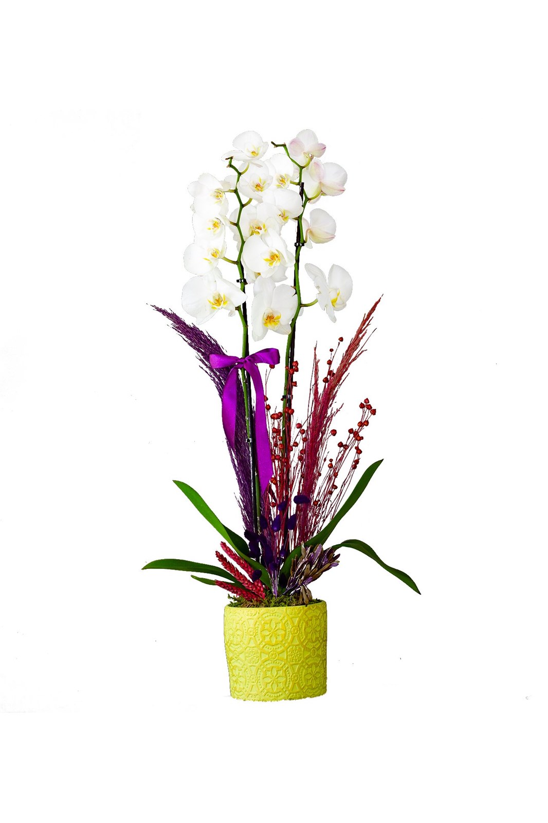 Eskitme Sarı Dekoratif Saksıda Beyaz Orkide