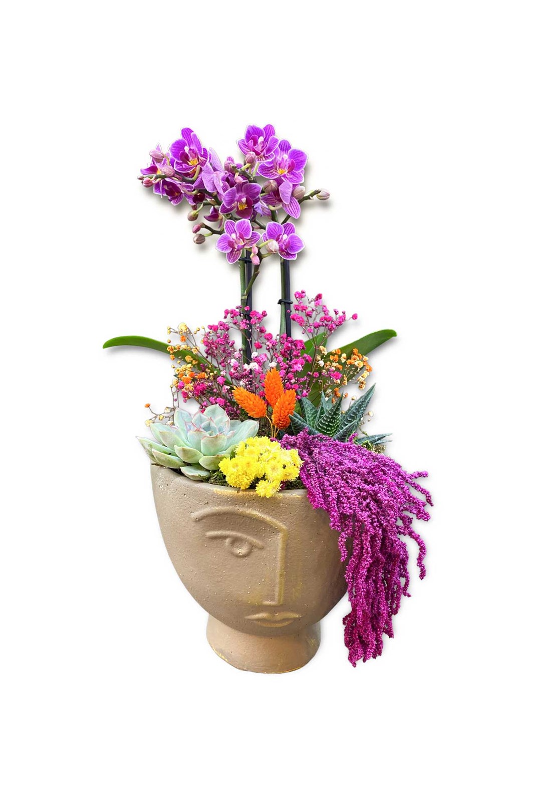 Yüz şeklinde beton saksı içerisinde, çift dallı mini orkide, 2 adet sukulent, şoklanmış bitkiler, kurutulmuş bitkiler ve kuru yosun kullanılarak tasarlanmıştır. Doğru bakım ile uzun yıllar size ve sevdiklerinize eşlik edecek şık bir hediyedir.