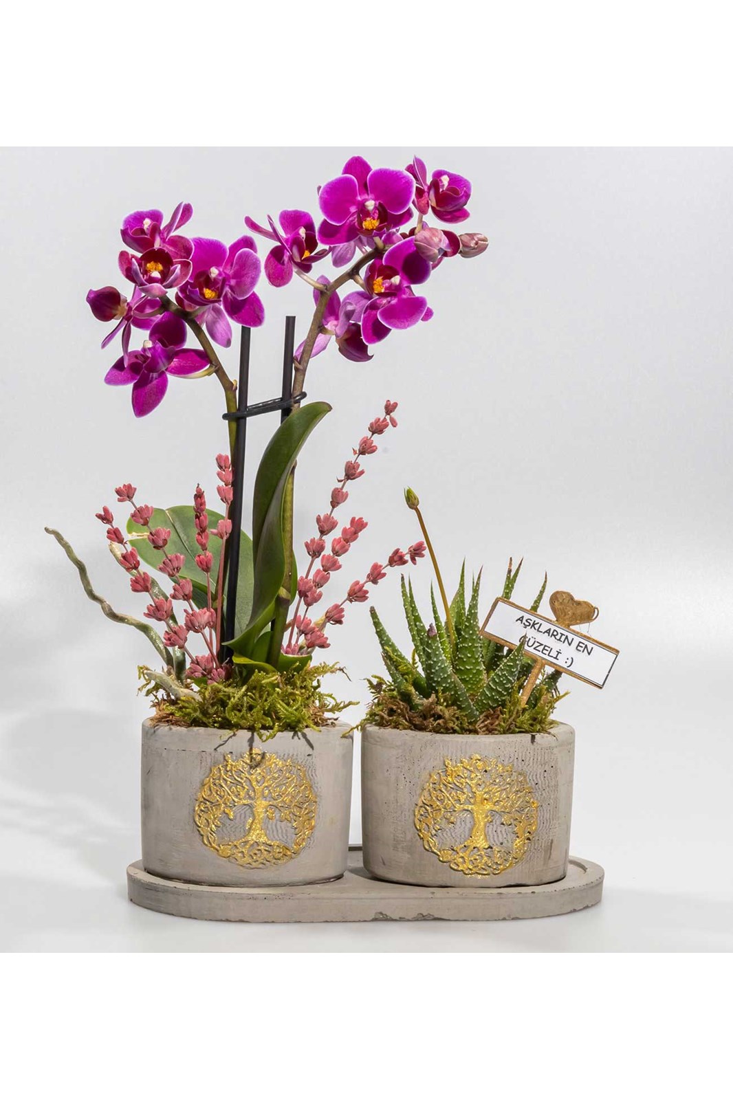2'li beton saksı içerisinde mini orkide ve haworthia türü sukulent kullanılmıştır. Doğru bakım ile uzun yıllar size ve sevdiklerinize eşlik edecek şık ve dekoratif bir hediyedir.