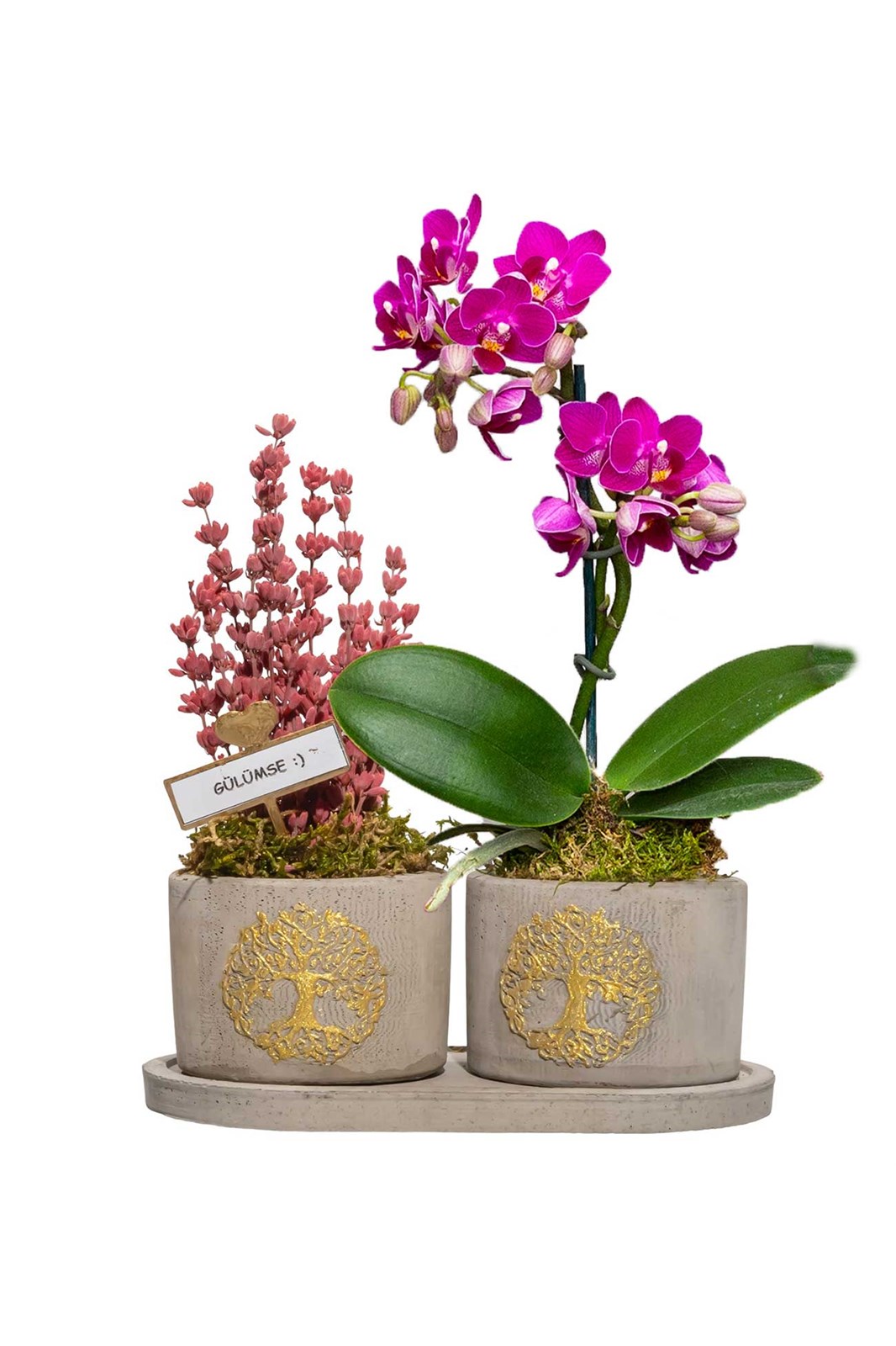 <p> 2'li beton saksı içerisinde mini orkide ve şoklanmış lavanta kullanılmıştır. Doğru bakım ile uzun yıllar size ve sevdiklerinize eşlik edecek şık ve dekoratif bir hediyedir.</p> <p> Mini orkideler aydınlık ama direk güneş ışığı almayan bir ortamda 3 günde bir defa yarım çay bardağı su ile sulamanız yeterli olacaktır.</p> <p dir="ltr"> ÖLÇÜLER : YÜKSEKLİK ( üzerindeki bitki ile birlikte ) 27cm</p> <p dir="ltr"> UZUNLUK : 16 cm</p> <p dir="ltr"> GENİŞLİK : 8 cm</p>
