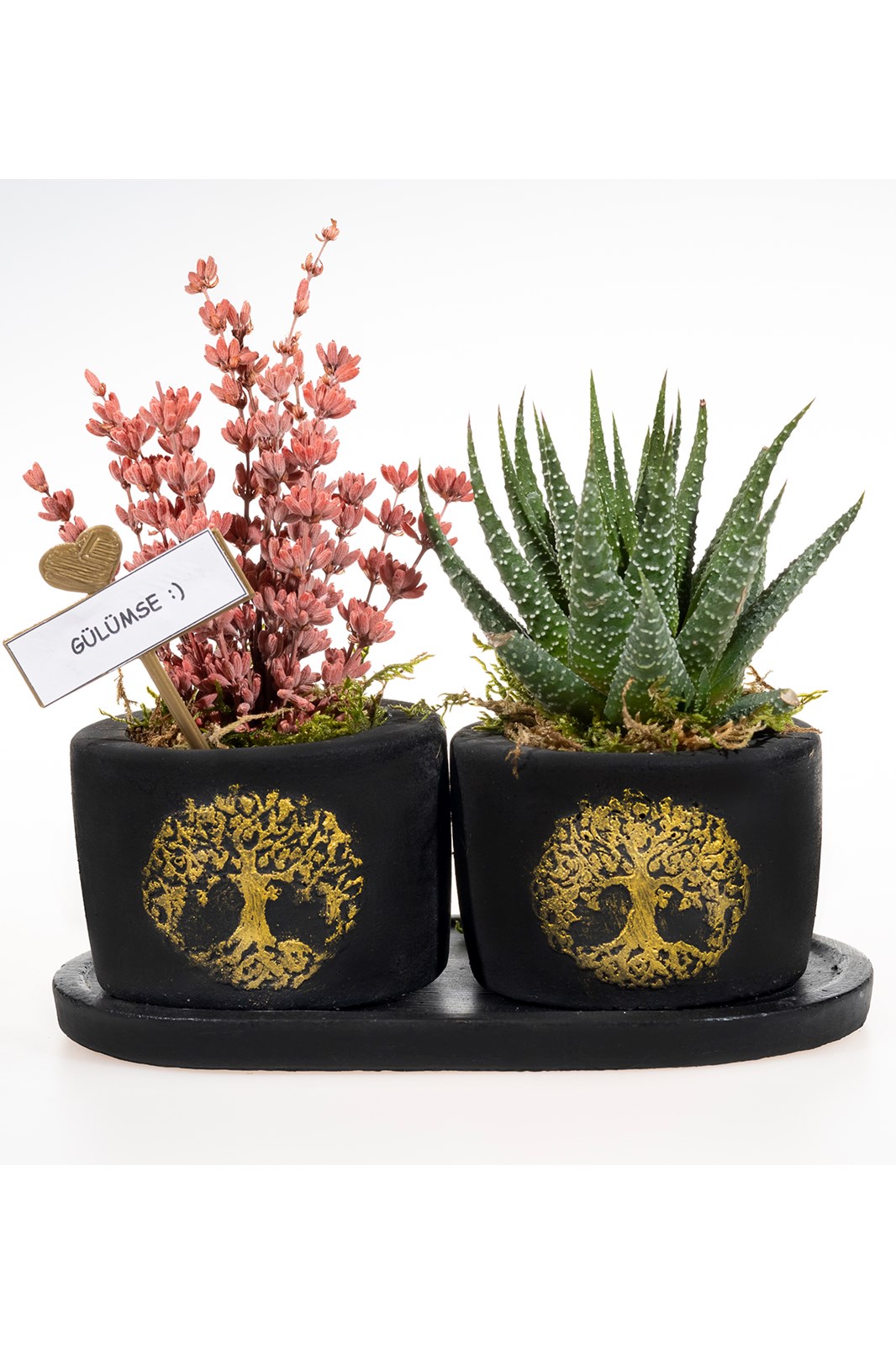 2'li beton saksı içerisinde 1 adet haworthia türü sukulent, kişiselleştirme için tabela ve şoklanmış lavanta kullanılmıştır. Doğru bakım ile size ve sevdiklerinize uzun yıllar eşlik edecek şık bir tasarımdır..