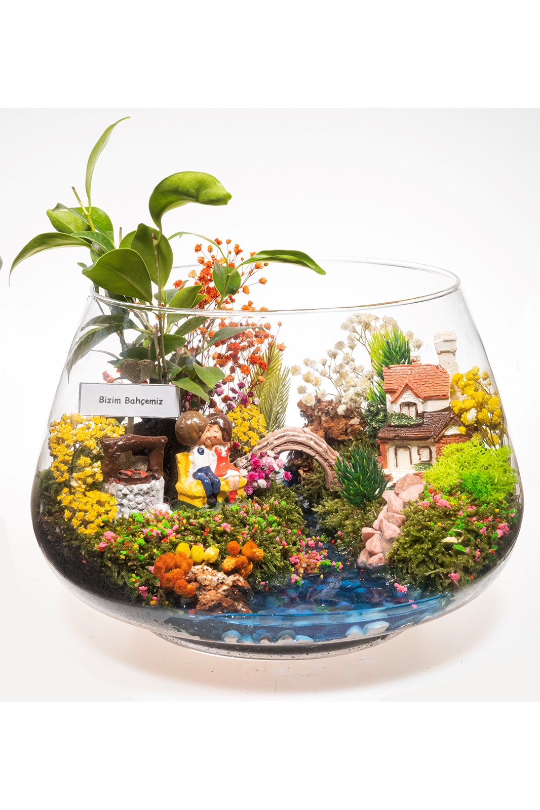 Doğanın sükûnetini ve büyüleyici güzelliklerini evinizin içinde hissetmek ister misiniz? Size mükemmel bir seçenek sunuyoruz: 25x20 cm boyutunda özel tasarım teraryumlar! Bu teraryumlar, içerisinde bulunan Ficus Ginseng bonsai ağacı, dere efekti için jel, minyatür çiftler, minyatür ev ve objelerle birleşerek büyüleyici bir doğa deneyimi sunar.