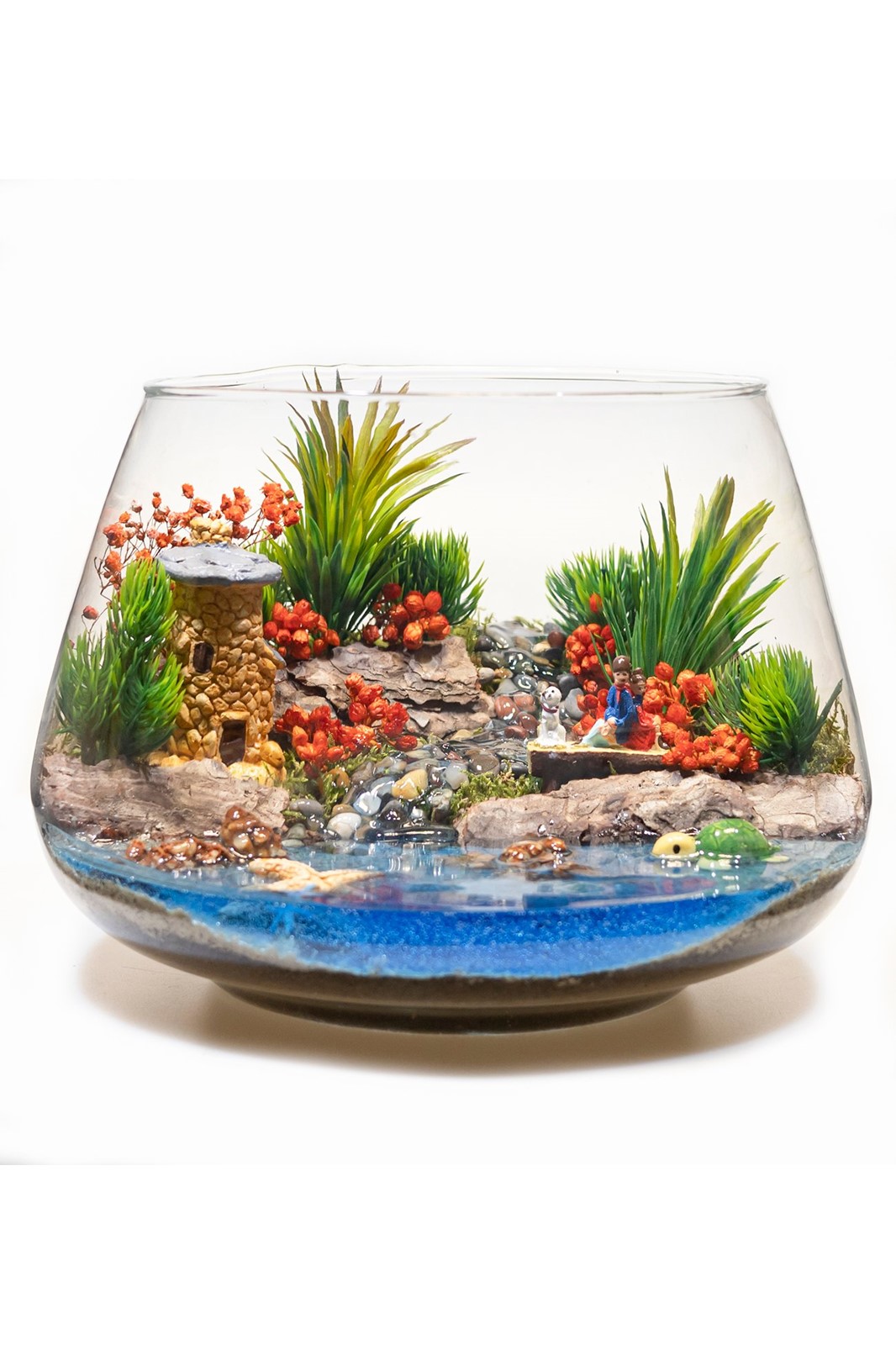 Cam fanus içerisinde Minyatür bir ev, kuru çiçekler,kuru yosun ve şoklanmış kuru bitkiler kullanılarak tasarlanmıştır. Dekoratif ve keyifli bir üründür. Ürün ebatı: 25x20 cm Kullandığımız tüm bitkiler, şoklanmış olduğundan herhangi bir bakıma ihtiyaç duymadan size ve sevdiklerinize uzun yıllar eşlik edecek şık bir üründür. Uzun süre görsellerini muhafaza ederler. Ürünümüzde kullanılan malzemeler stoklara göre değişiklik gösterebilir.