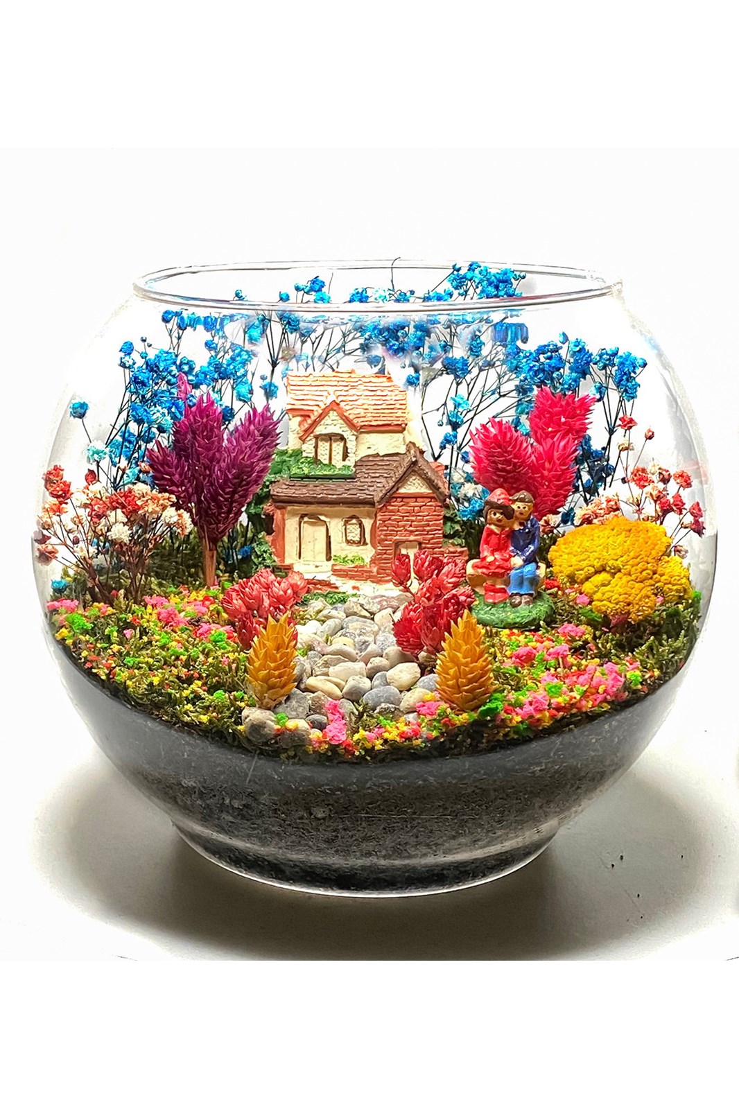 Mini cam fanus içerisinde yapay bitkiler,kuru bikiler, yeşil yosun, dekoratif taş ve maket malzemeler kullanılmıştır. Bakıma ihitiyaç duymadan size ve sevdiklerinize uzun yıllar eşlik edecek şık. Boyutlar 12x13cm'dir.