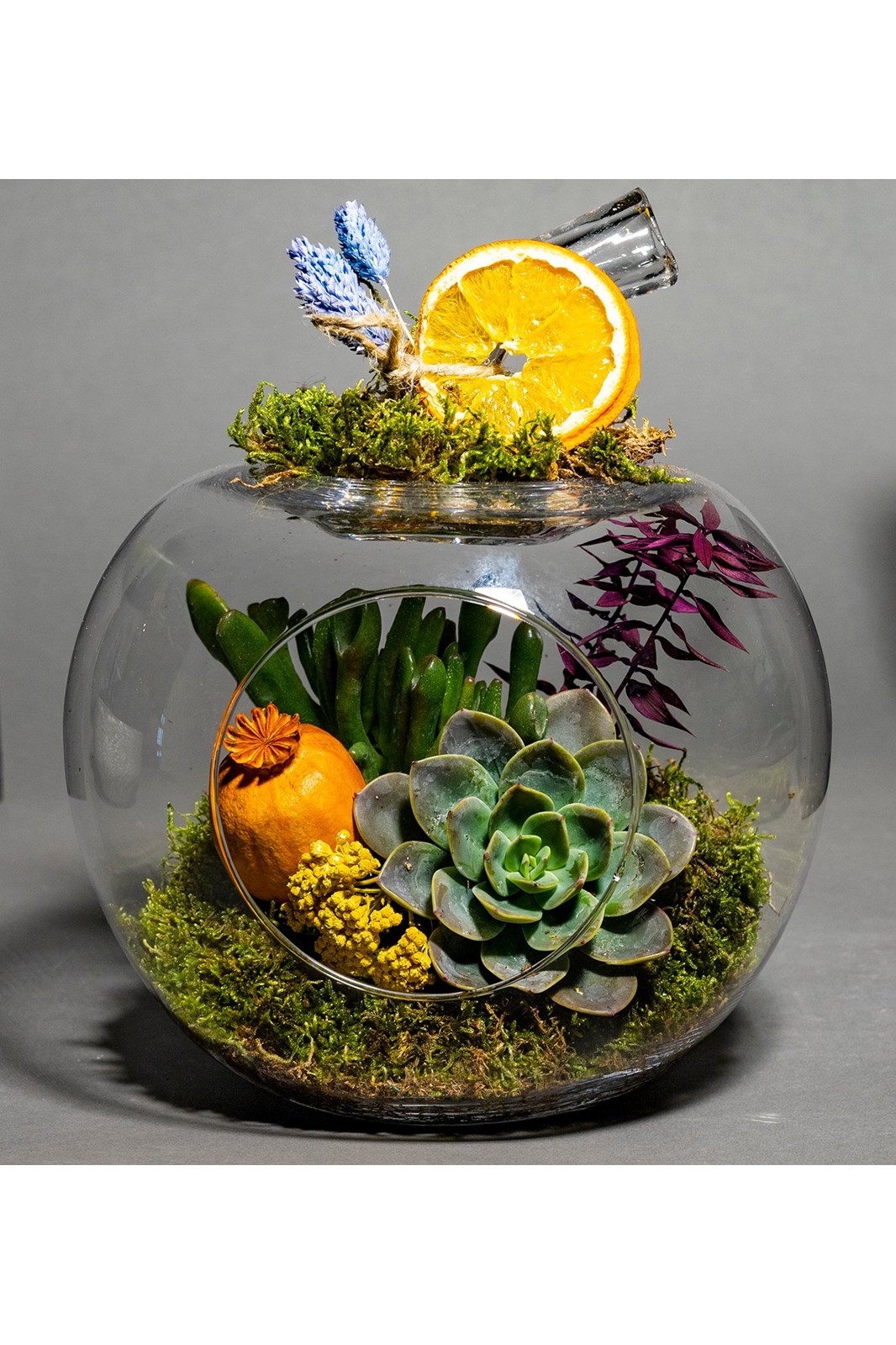 İlkbahar renkleri, canlı sukulentler, kuru bitkiler...Sizi başka bir dünyaya götürüyoruz. küçük boy elma Cam fanus içerisinde ; Kurutulmuş bitkiler, 3 adet sukulent ve kuru yosun kullanılarak tasarlanmıştır. Doğru bakım ile yıllarca size eşlik edecek bir üründür. Kullanılan sukulentler mevsimlere göre farklılık göstermektedir.