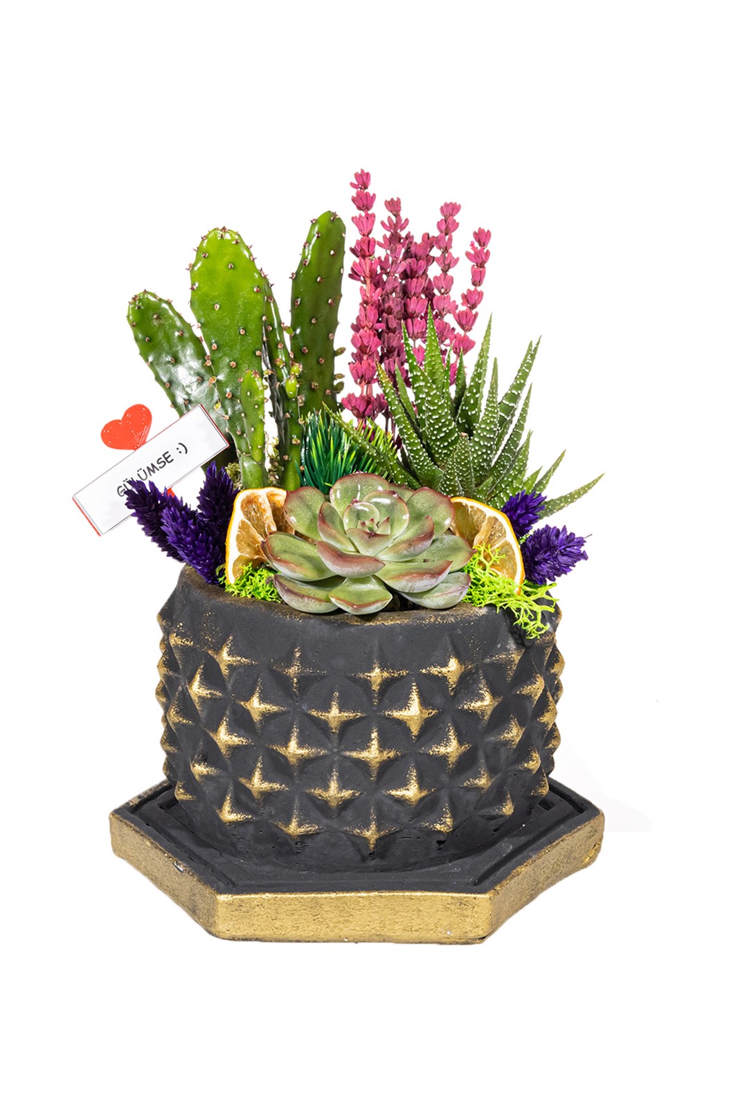El yapımı yıldız desenli beton saksı içerisinde 1 adet kaktüs türü sukulent, 1 adet echeveria türü sukulent, 1 adet howarthia türü sukulent, kurutulmuş limon, şoklanmış lavanta ve kuru bitkiler kullanılarak tasarlanmıştır. bulunduğu ortamlara doğal bir hava katacaktır. doğru bakım ile size ve sevdiklerinize uzun yıllar eşlik edecek şık ve dekoratif bir üründür.